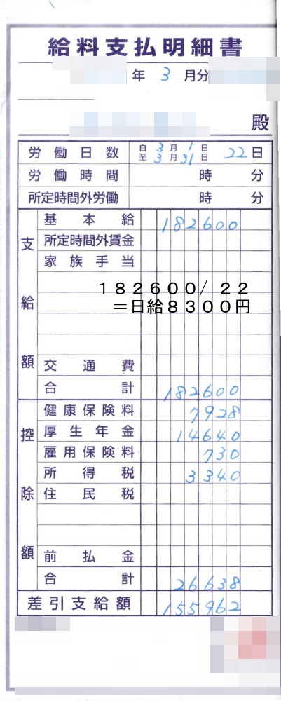 拘束時間は朝食や着替えは除いて、朝の6時半頃家を出て、17時半に帰ってくるので、およそ11時間、8300円なら時給755円、7千円なら時給637円。まあ、アホらしくなって来ますね。
